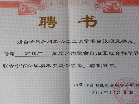 高林广经理被聘为自治区社科联第六届学术委员会委员